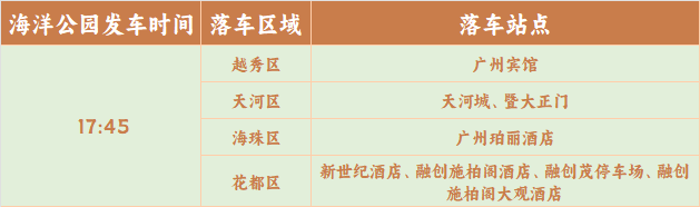 广州到香港海洋公园直通大巴在每个区都有上车站点,而从香港海洋公园回广州,只有上图一个班次,请广州到海洋公园的朋友提前购买回程车票。